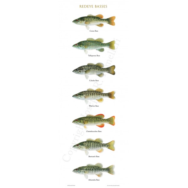 Limited edtion giclée print, 10 x 24" picturing Coosa bass, Tallapoosa bass, Cahaba bass, Warrior bass, Chattahoochee bass, Bartram's bass, and Altamaha bass.