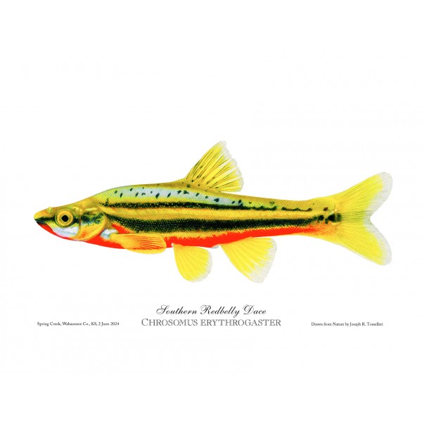 8 x 10" giclée print of a spawning male Southern Redbelly Dace.  This specimen collected from Spring Creek in Wabaunsee County Kansas in early June of 2024 during the annual Fish Wizards Tour.  Has the brightest coloration that I've ever seen in a redbelly dace.  Spectacular specimen.